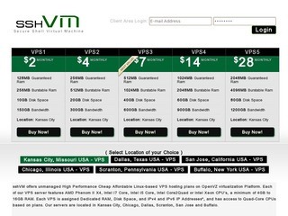 sshVM来自印度的一家主营美国低端VPS的服务商,经常推出比较优惠的VPS产品,本次推出的优惠方案使用OpenVZ架构,无管理型号,仅支持Linux操作系统,数据中心可以选择堪萨斯城、芝加哥、达拉斯、纽约水牛城。128M独立内存,256M突发内存,10G硬盘,250G流量,半年付11美元,年付19美元。