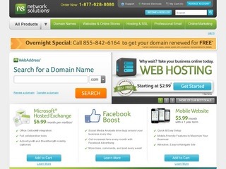 $0.99 domain offer applies to nsWebAddress™ product for new purchases of domain extensions .com, .net, .org, .biz, and .info only. Available for 1 year terms. Upon expiration, all domains will be renewed at the then current price. Cannot be combined with any other offer. Discount applied in shopping cart. Term discounts do not apply. This offer is available for online purchases at NetworkSolutions.com only. Maximum 3 domain names can be purchased at ONE time. Offer good at time of initial purchase only.