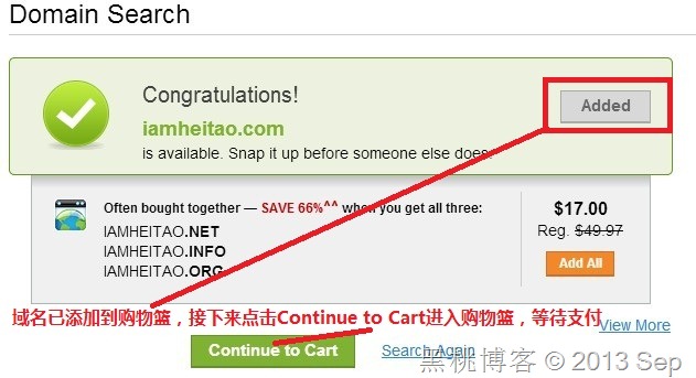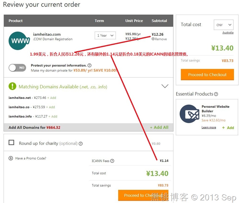 另外,在这个选项下面有一个Have a Promo Code?的按钮,这个就是优惠码的填写处,只有在需要用到优惠码的订单中才会用到,因为本文提到的优惠域名不需要使用优惠码,所以这里跳过。
