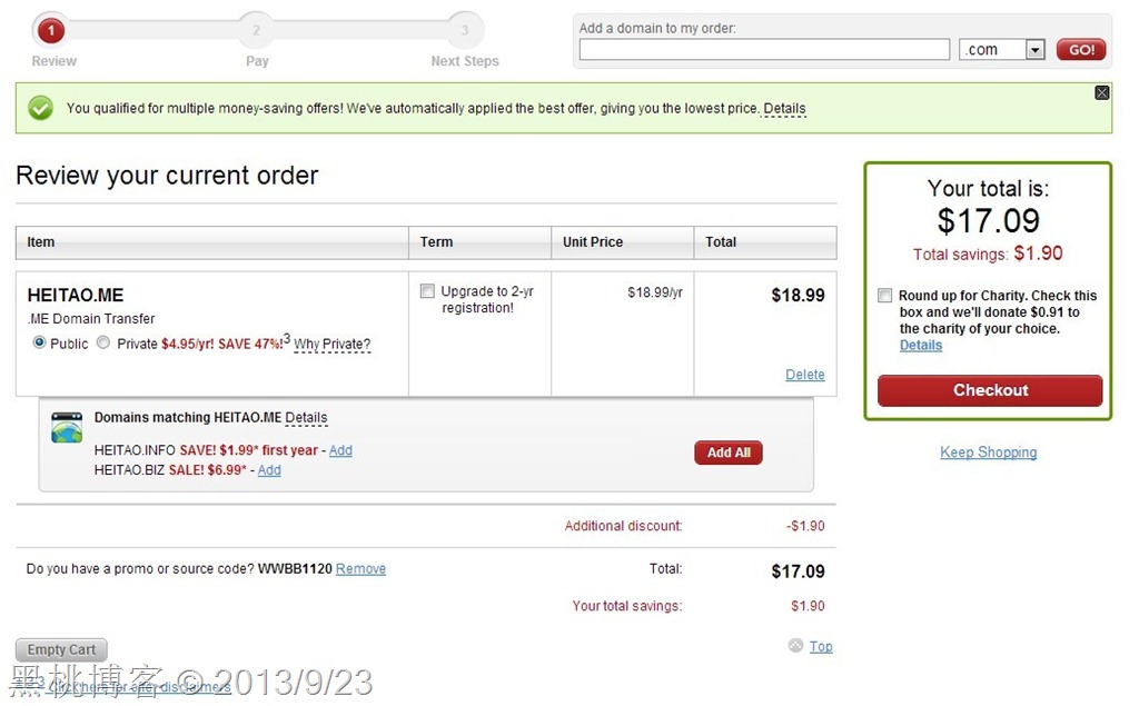 第三步,在打开的页面输入要转移的.ME域名,如heitao.me,点击红色的GO按钮后,弹出一个Available For Transfer,表示此域名可以转入(请注意,如果你的域名已经在MadDog了,则不可以转入,只能续费,但是续费价格不能使用此方法,但是包括Godaddy及其其他代理的域名可以在这里转入),然后点击Proceed to Checkout按钮后进入购物车,如下图所示,转入价格为18.99,嗯,因为我已经填入了10%的优惠码,所以最终价格是17.09,但这不是我们要的结果,继续下一步