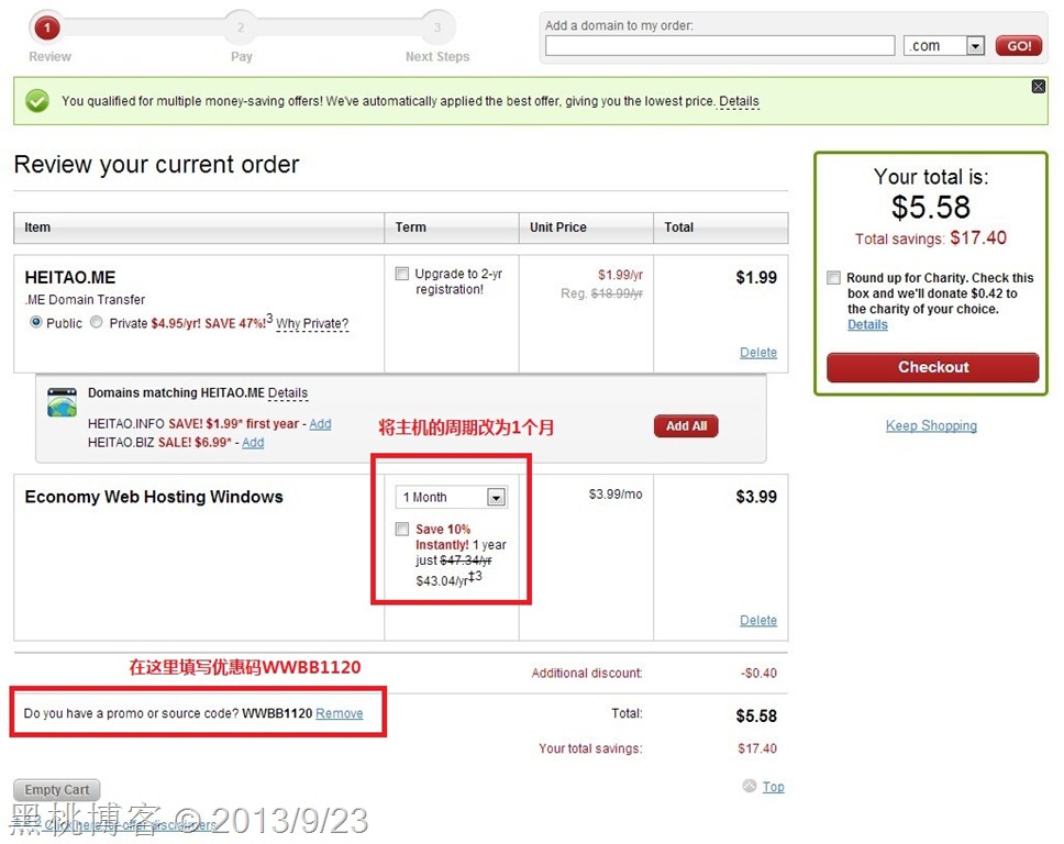 第六步,请注意如果你的价格不是5.58,美金,在上图红色框内点击Click here链接,输入wwbb1120后点Apply即可获取额外的10%优惠,然后,去付款吧。5.58美元的.ME域名转移。当然,后续还需要一些转移的设置,例如安全码,转移码的输入,这里就不介绍了,不懂的朋友可以留言给我,我会单独辅助你完成域名转移。